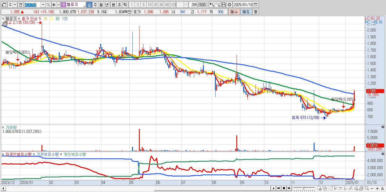 - 벨로크 (1,085원 ▲ 15.18% , 시총: 213억, 거래량: 1,800,678, 거래대금:18억)