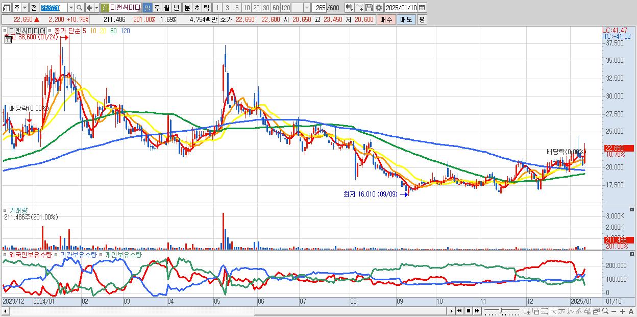 - 디앤씨미디어 (22,650원 ▲ 10.76% , 시총: 2,837억, 거래량: 211,486, 거래대금:48억)
