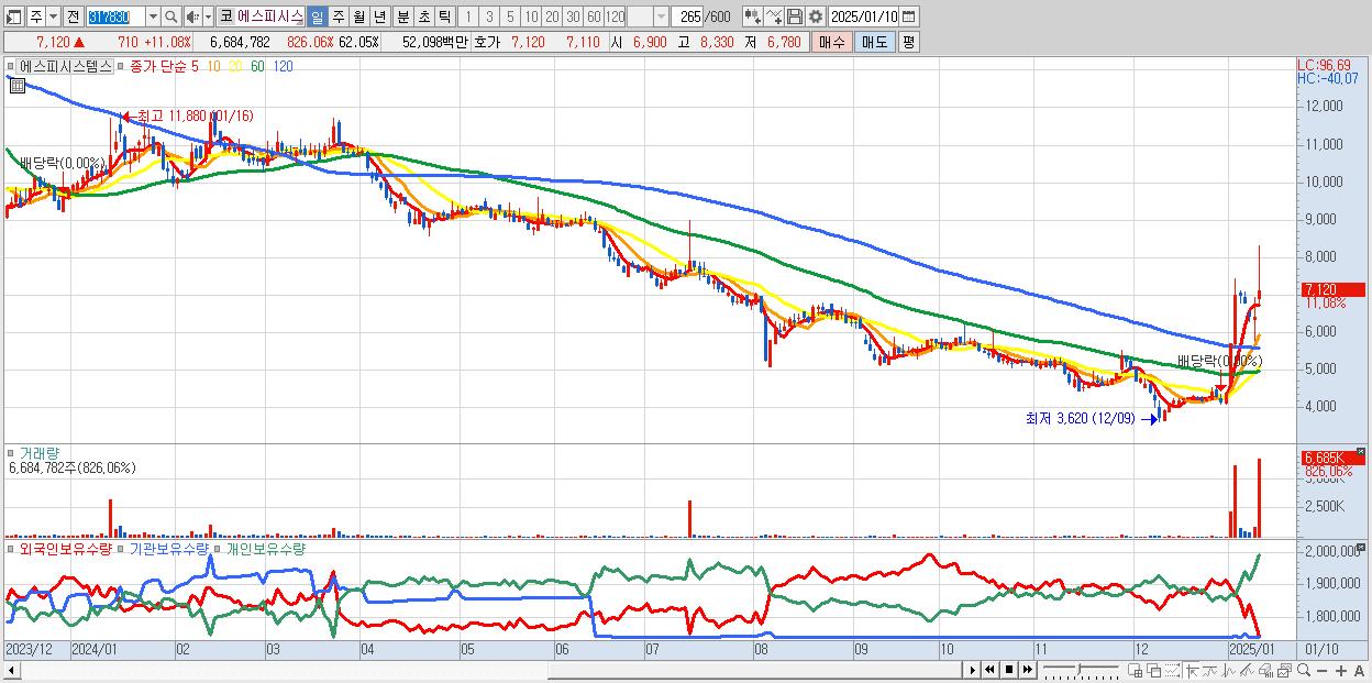 - 에스피시스템스 (7,120원 ▲ 11.08% , 시총: 767억, 거래량: 6,684,782, 거래대금:521억)