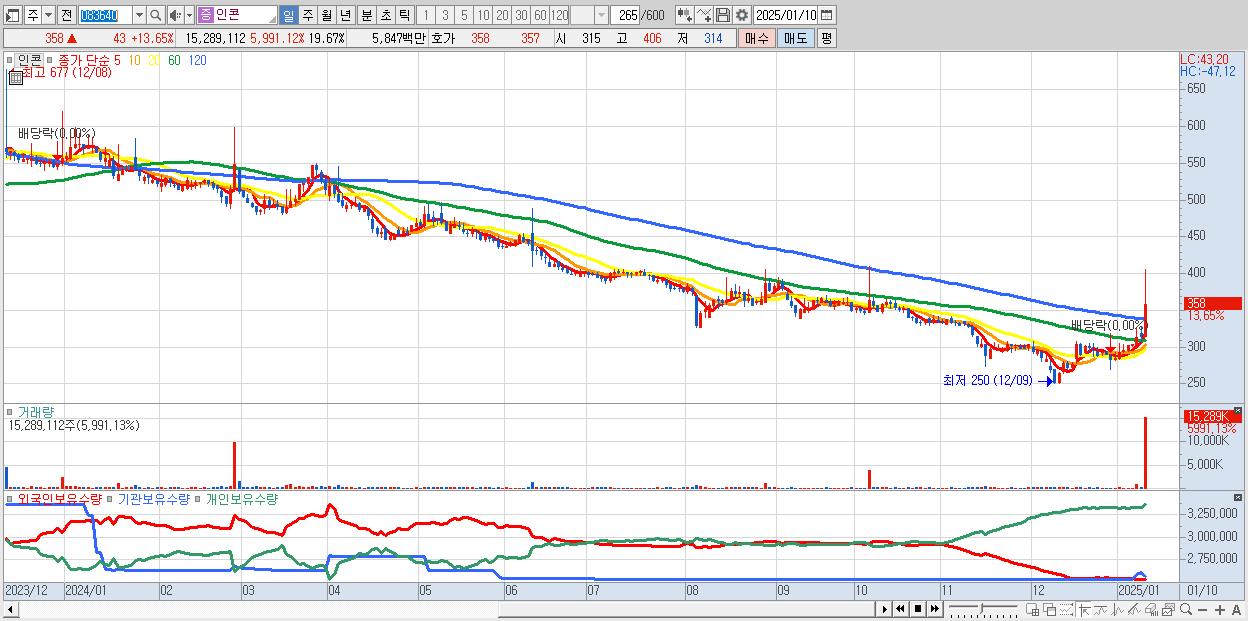 - 인콘 (358원 ▲ 13.65% , 시총: 278억, 거래량: 15,289,112, 거래대금:58억)