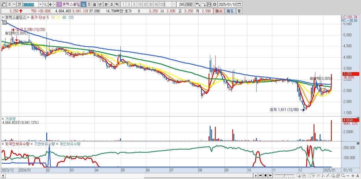 - 휴맥스홀딩스 (3,250원 ▲ 30% , 시총: 409억, 거래량: 4,664,403, 거래대금:148억)