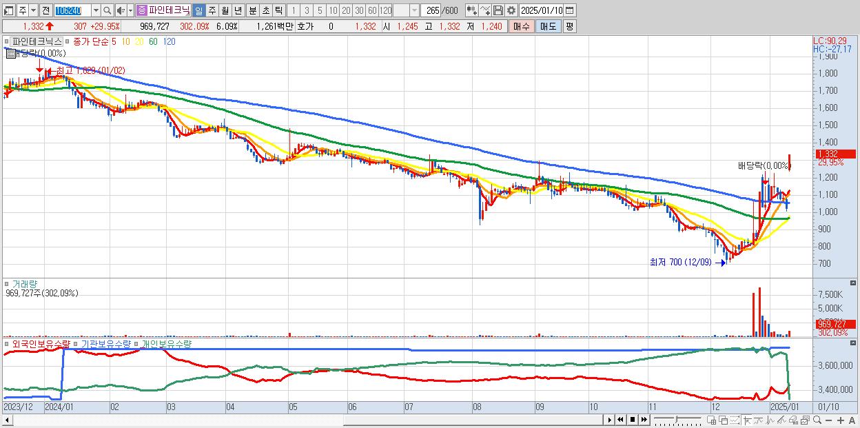 2.파인테크닉스 1,332원 ▲ 29.95% (KOSDAQ, 106240)