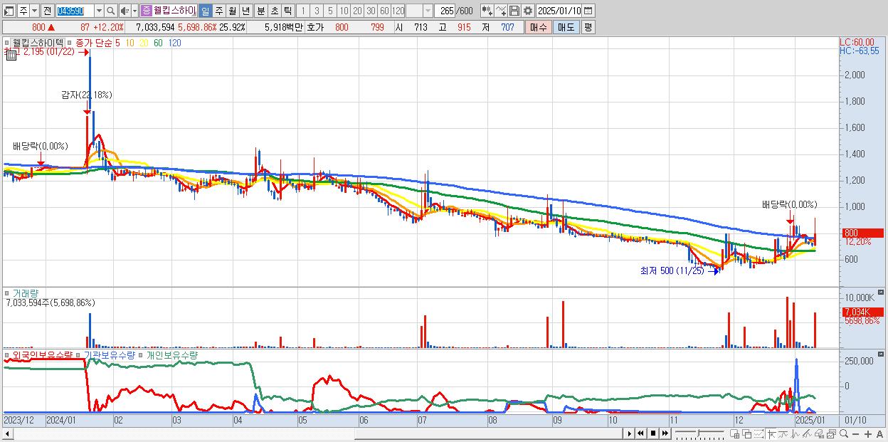 - 웰킵스하이텍 (800원 ▲ 12.2% , 시총: 217억, 거래량: 7,033,594, 거래대금:59억)