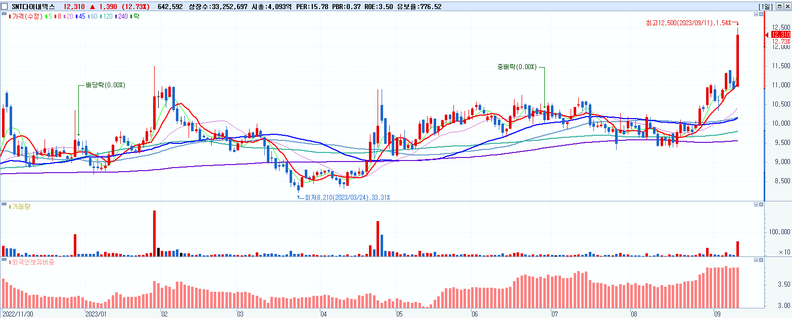 - SNT다이내믹스 (12,310원 ▲ 12.73% , 시총: 4,093억, 거래량: 642,992, 거래대금:78억)