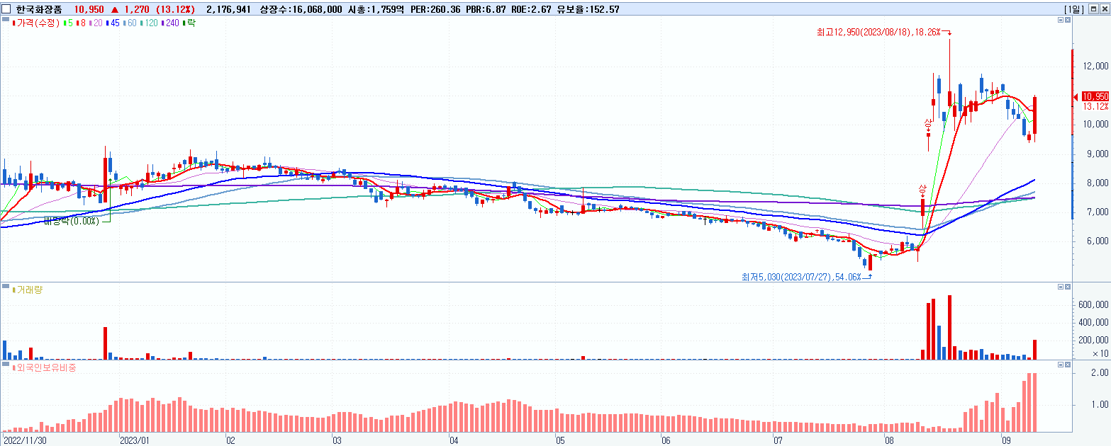 - 한국화장품 (10,950원 ▲ 13.12% , 시총: 1,759억, 거래량: 2,209,329, 거래대금:232억)