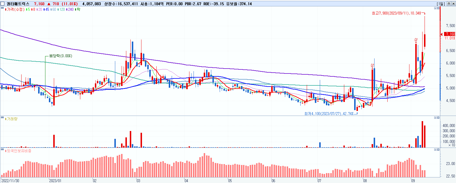 - 퀀타매트릭스 (7,160원 ▲ 11.01% , 시총: 1,184억, 거래량: 4,059,800, 거래대금:300억)