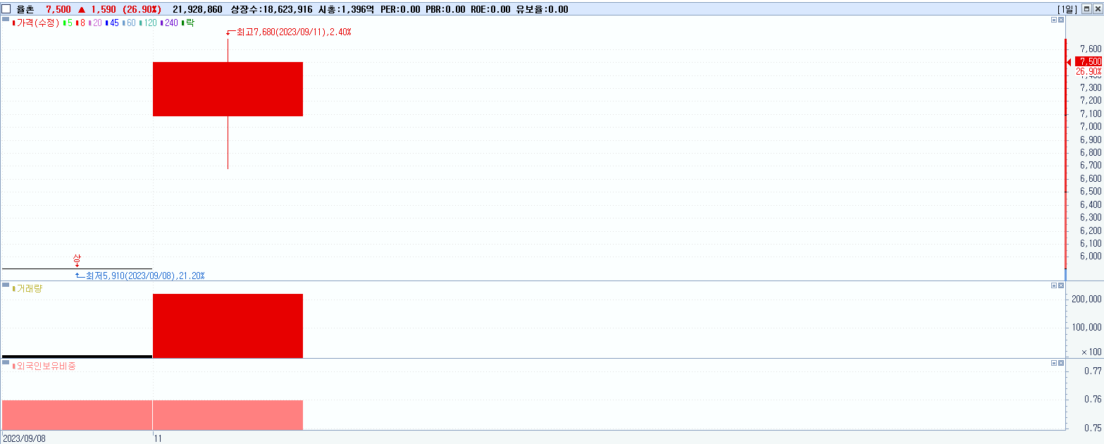 - 율촌 (7,500원 ▲ 26.9% , 시총: 1,397억, 거래량: 22,017,703, 거래대금:1,614억)