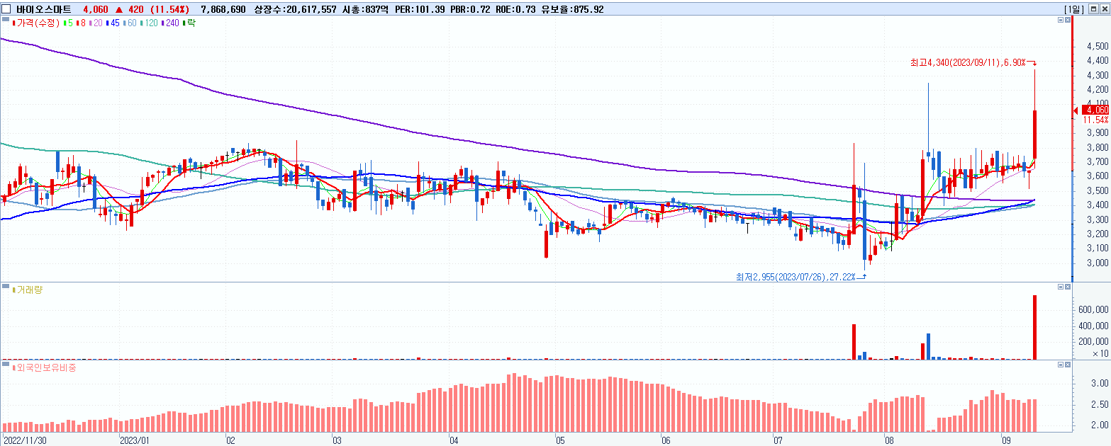 - 바이오스마트 (4,060원 ▲ 11.54% , 시총: 837억, 거래량: 7,872,447, 거래대금:322억)