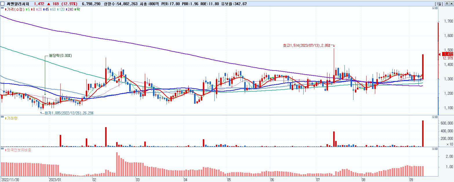 - 씨엔알리서치 (1,472원 ▲ 12.97% , 시총: 807억, 거래량: 6,819,813, 거래대금:96억)
