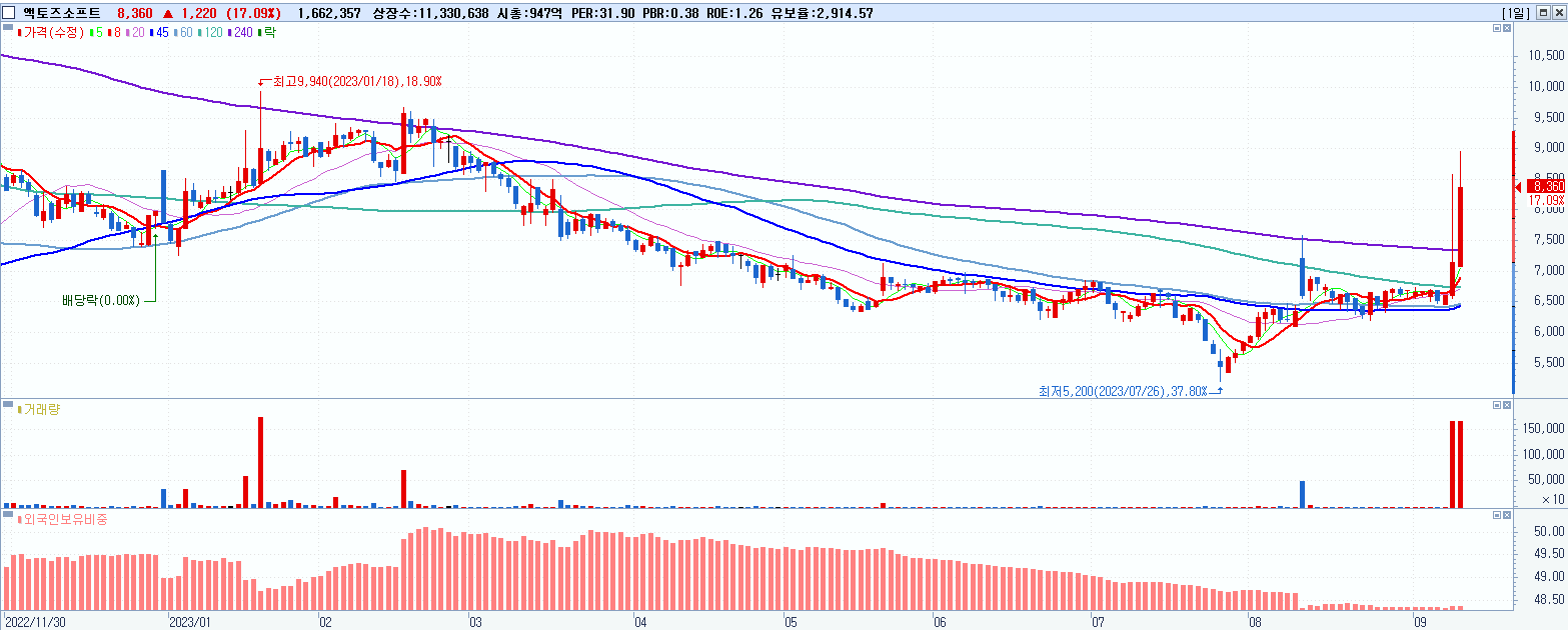 - 액토즈소프트 (8,360원 ▲ 17.09% , 시총: 947억, 거래량: 1,669,477, 거래대금:139억)