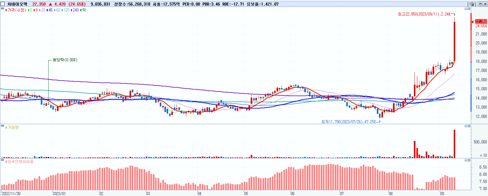 - 차바이오텍 (22,350원 ▲ 24.65% , 시총: 12,576억, 거래량: 9,054,870, 거래대금:1,929억)