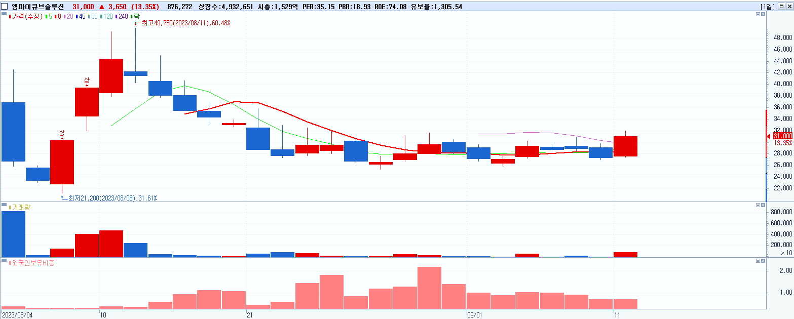 - 엠아이큐브솔루션 (31,000원 ▲ 13.35% , 시총: 1,529억, 거래량: 877,502, 거래대금:267억)