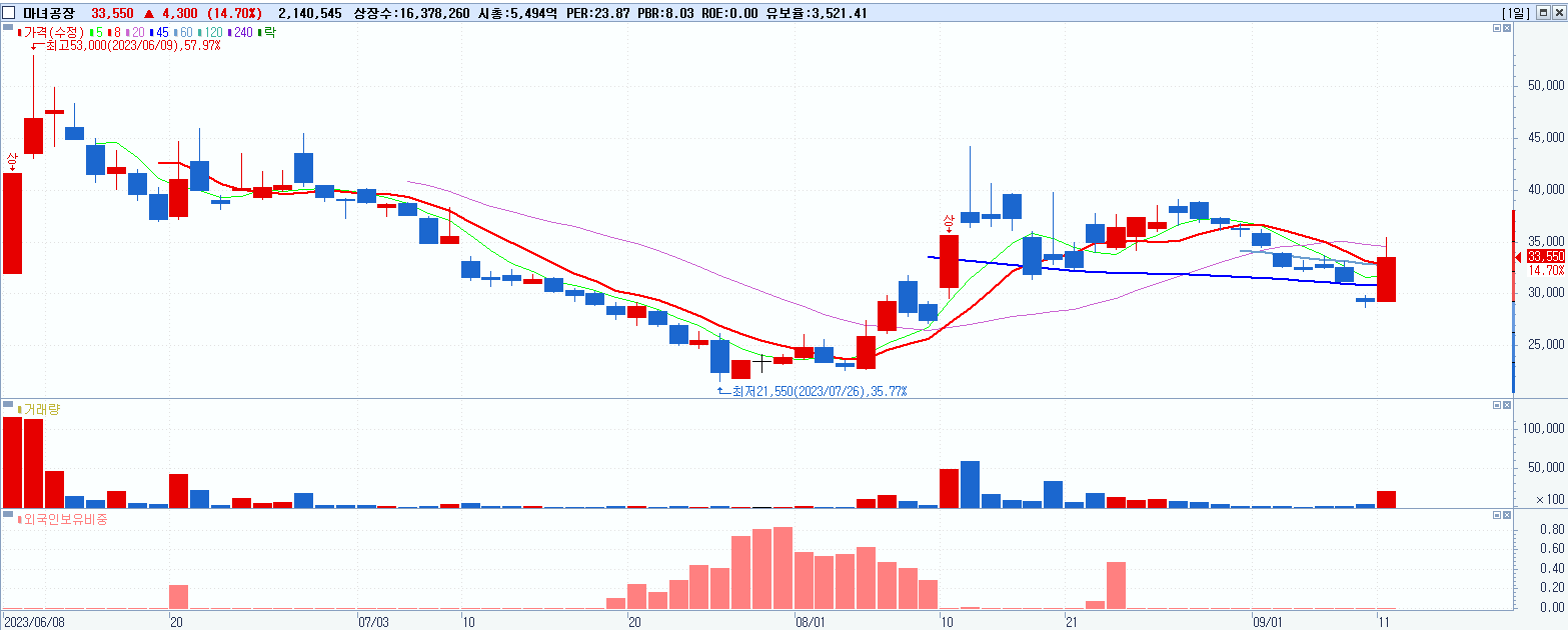 - 마녀공장 (33,550원 ▲ 14.7% , 시총: 5,495억, 거래량: 2,156,337, 거래대금:704억)