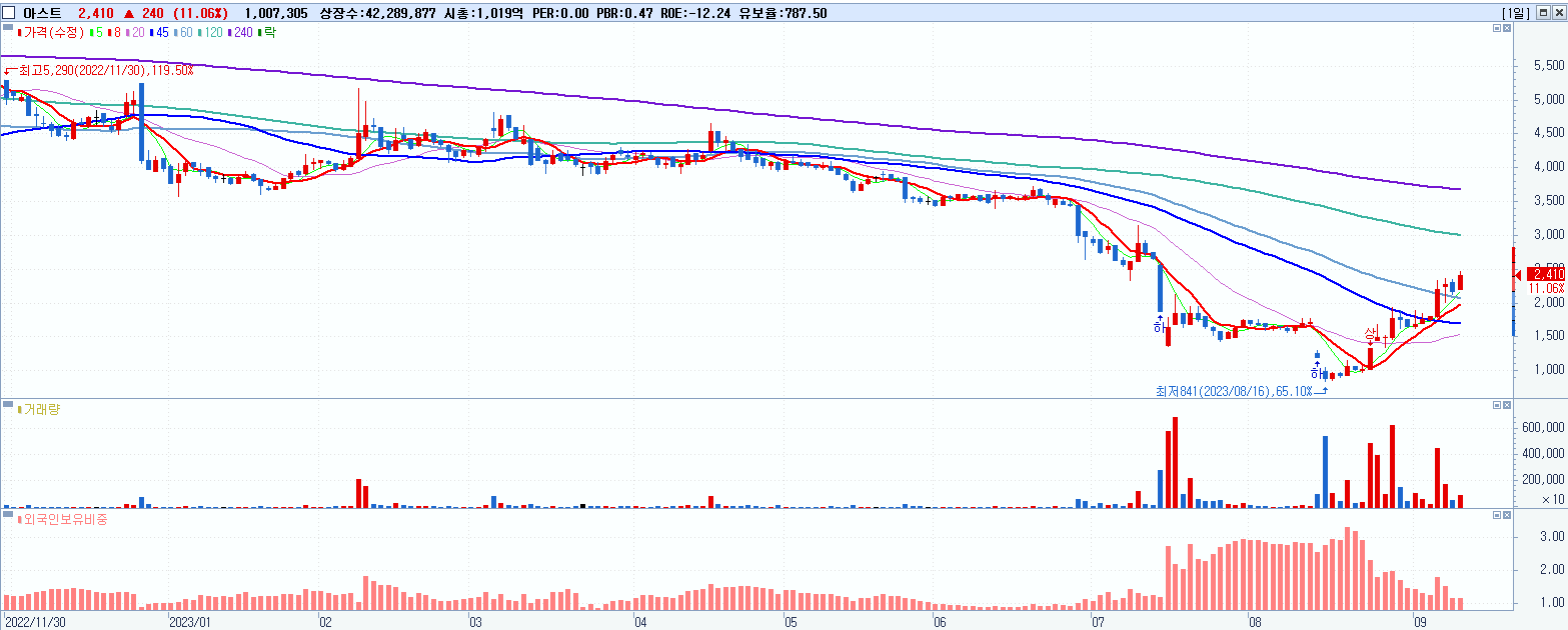 - 아스트 (2,410원 ▲ 11.06% , 시총: 1,019억, 거래량: 1,009,191, 거래대금:24억)