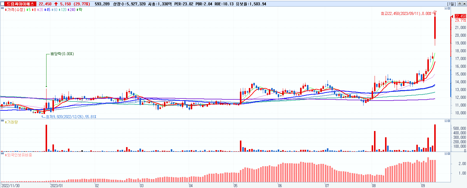 2.드림씨아이에스 22,450원 ▲ 29.77% (KOSDAQ, 223250)