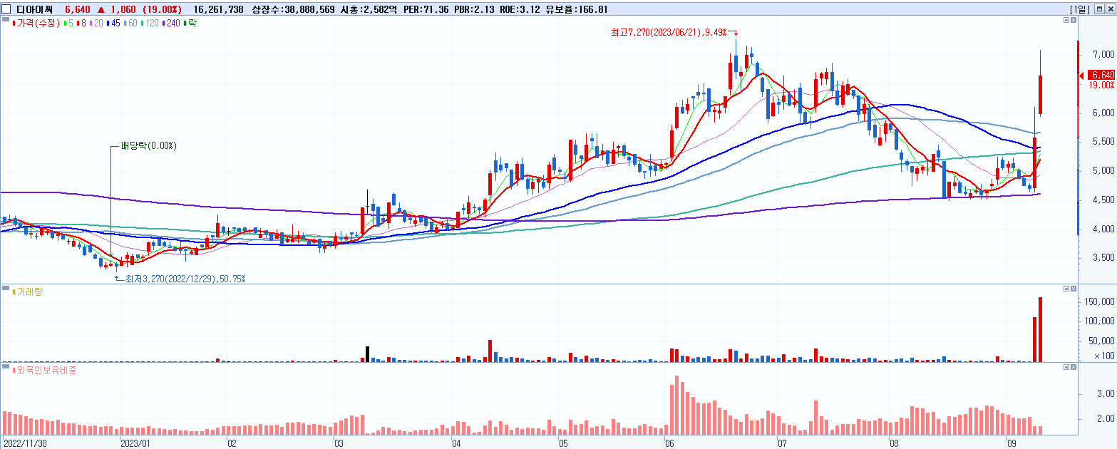 - 디아이씨 (6,640원 ▲ 19% , 시총: 2,582억, 거래량: 16,280,066, 거래대금:1,076억)