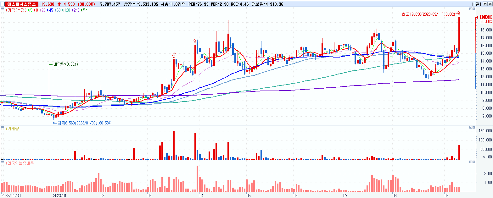 - 에스피시스템스 (19,630원 ▲ 30% , 시총: 1,871억, 거래량: 7,787,681, 거래대금:1,465억)