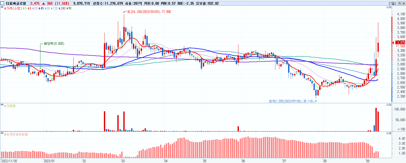 - 티피씨글로벌 (3,475원 ▲ 11.56% , 시총: 392억, 거래량: 9,073,885, 거래대금:328억)