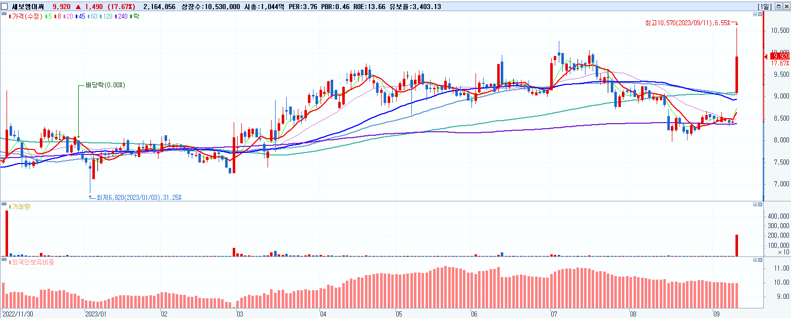 - 세보엠이씨 (9,920원 ▲ 17.67% , 시총: 1,045억, 거래량: 2,167,877, 거래대금:215억)