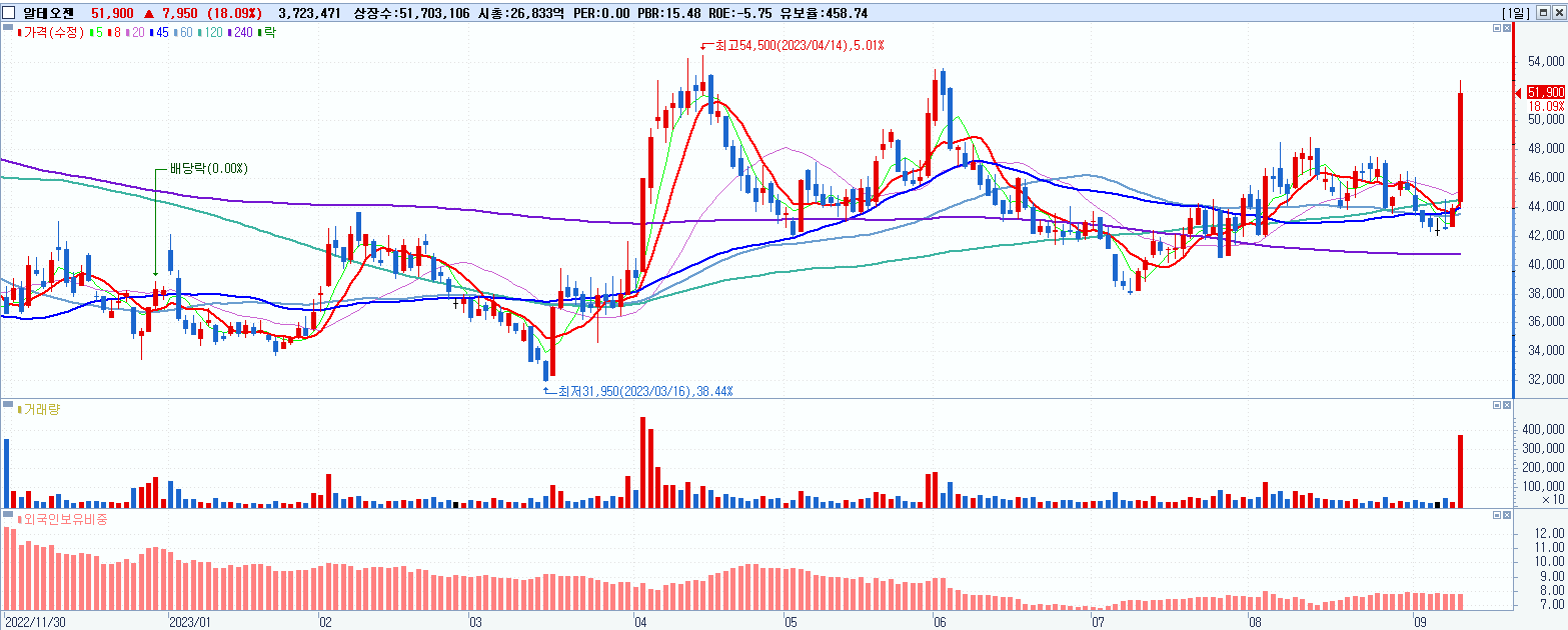 - 알테오젠 (51,900원 ▲ 18.09% , 시총: 26,834억, 거래량: 3,727,626, 거래대금:1,852억)