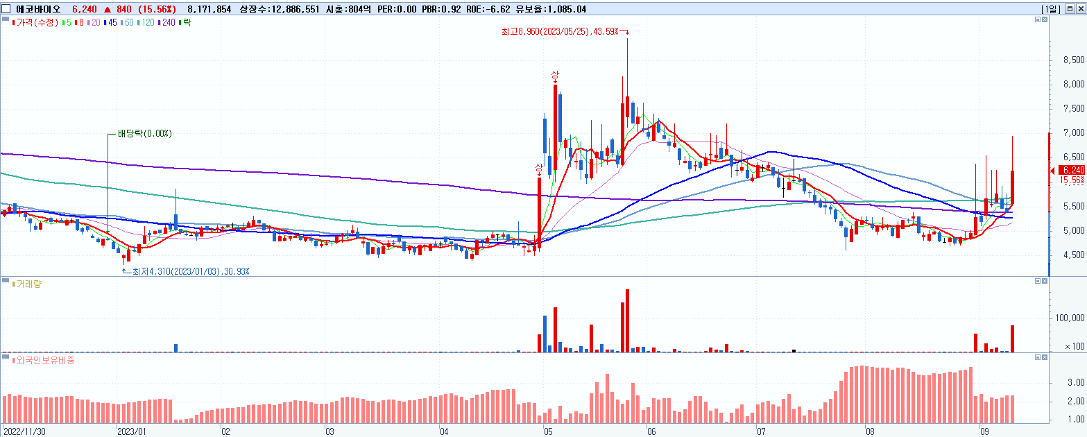- 에코바이오 (6,240원 ▲ 15.56% , 시총: 804억, 거래량: 8,183,866, 거래대금:528억)