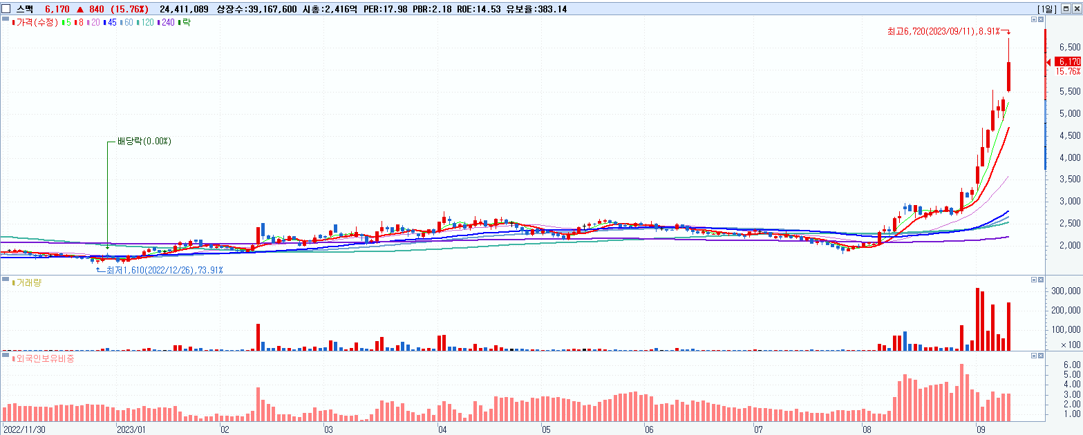- 스맥 (6,170원 ▲ 15.76% , 시총: 2,417억, 거래량: 24,455,575, 거래대금:1,523억)