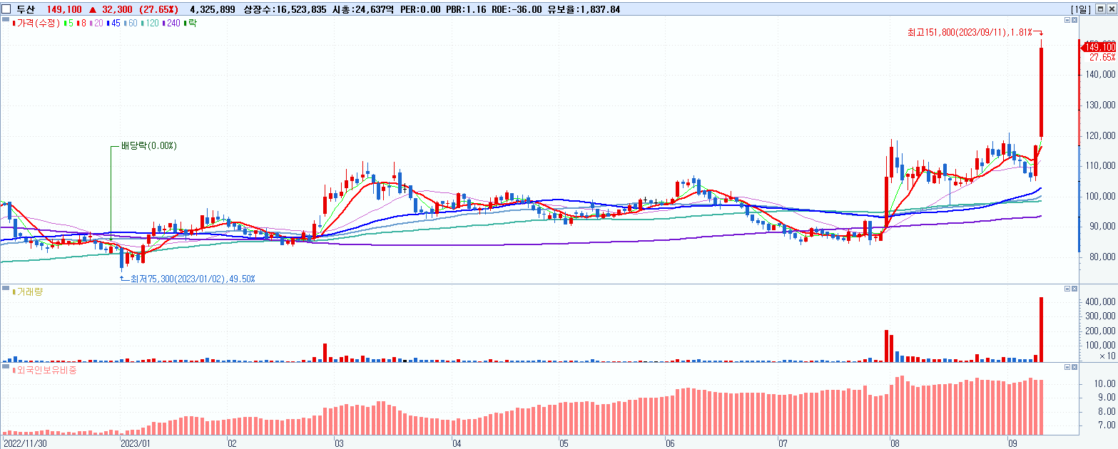 - 두산 (149,100원 ▲ 27.65% , 시총: 24,637억, 거래량: 4,338,340, 거래대금:6,278억)