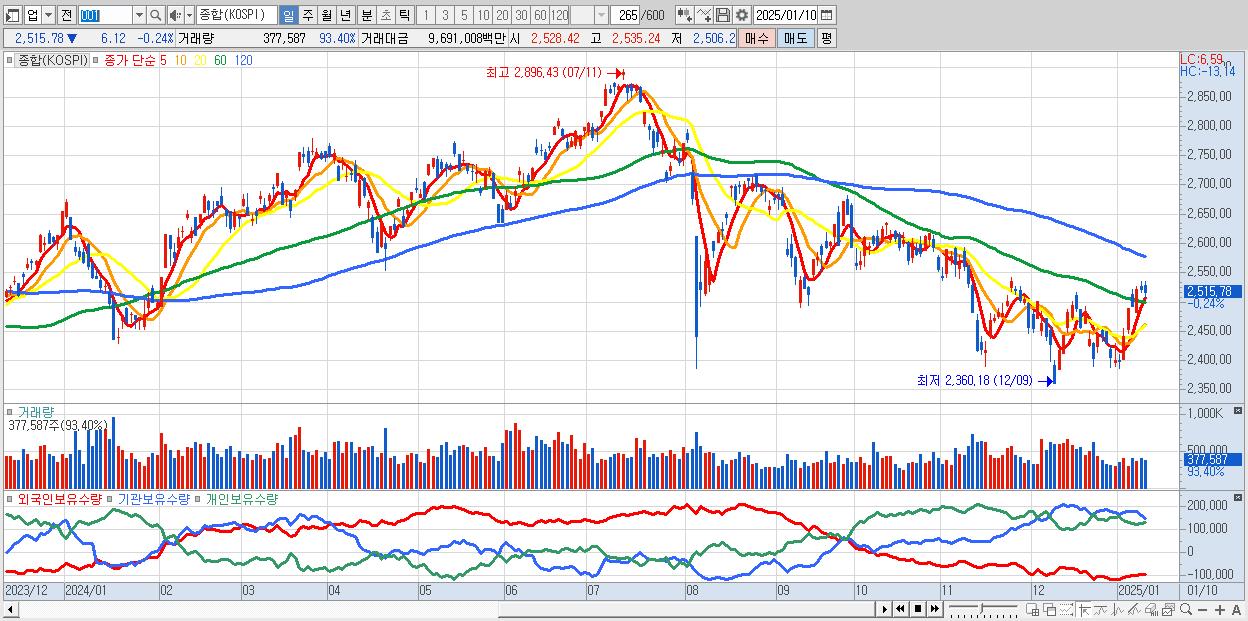 01/10 | 2,515.78 | ▼-0.24% | 3,381억 | -16억 | -3,976억 | 610억 |