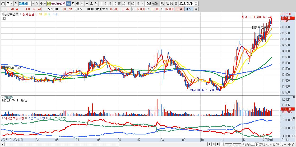 - 동성화인텍 (16,780원 ▲ 2.94% , 시총: 5,032억, 거래량: 599,831, 거래대금:100억, KOSDAQ)