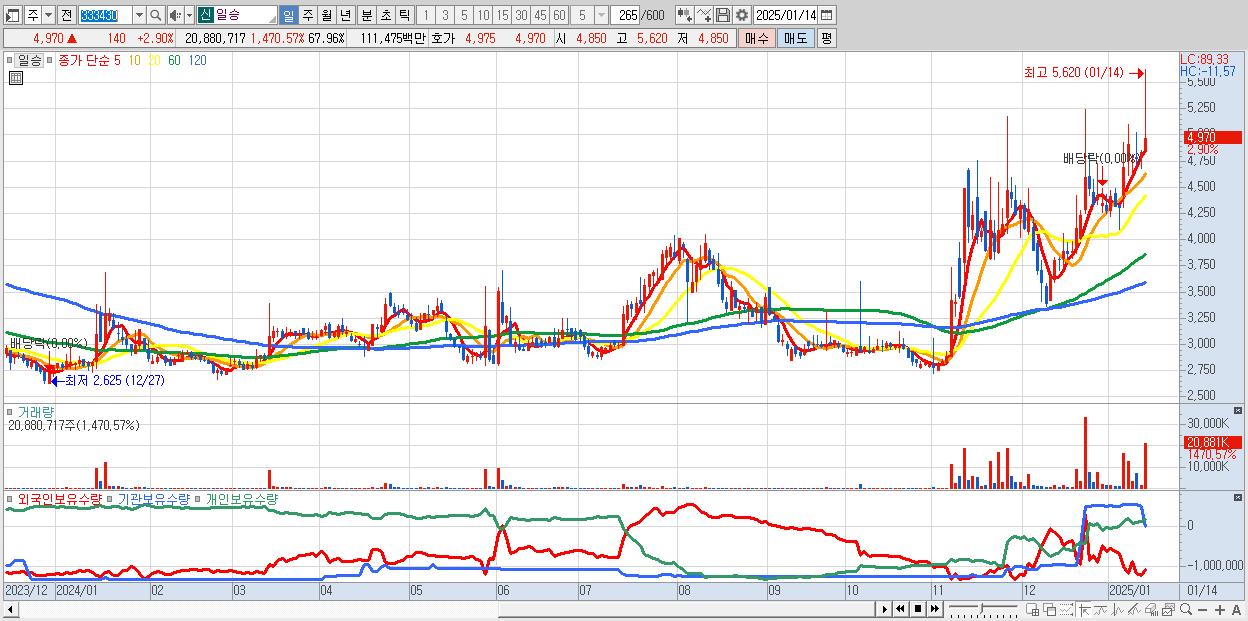 - 일승 (4,970원 ▲ 2.9% , 시총: 1,527억, 거래량: 20,880,717, 거래대금:1,115억)