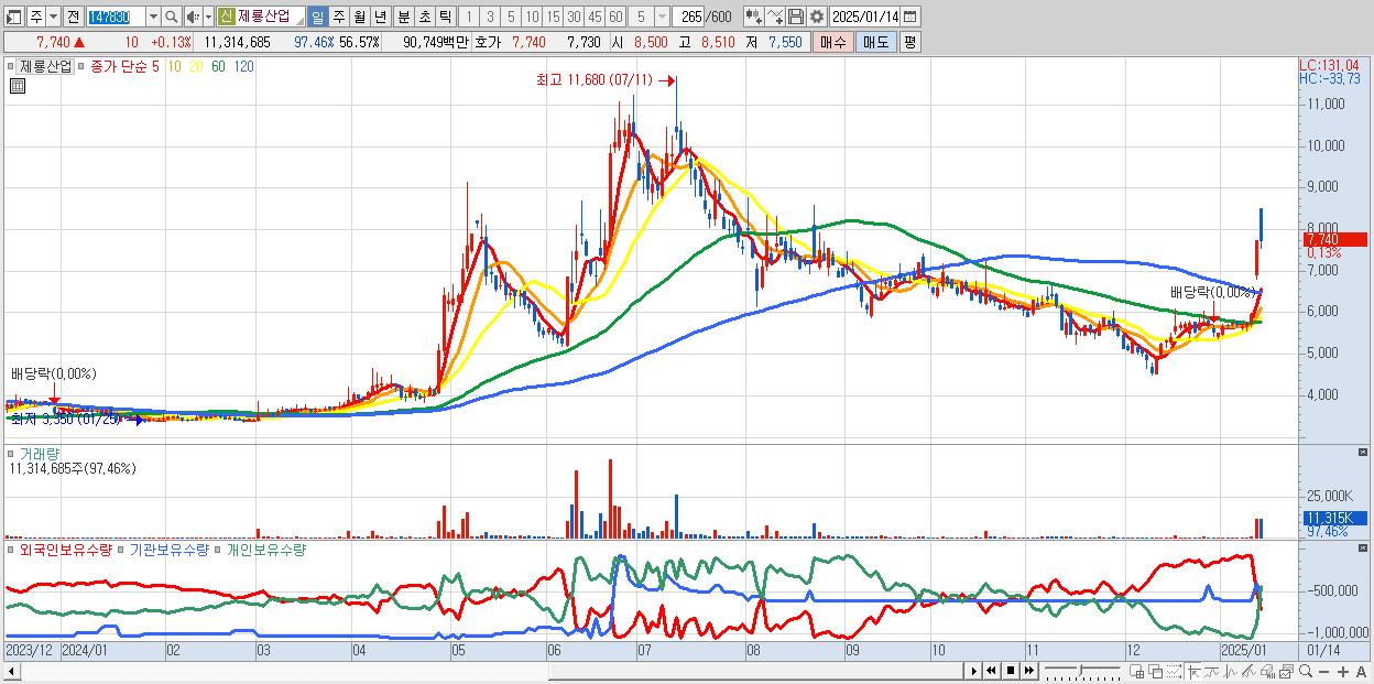- 제룡산업 (7,740원 ▲ 0.13% , 시총: 1,548억, 거래량: 11,314,685, 거래대금:907억)