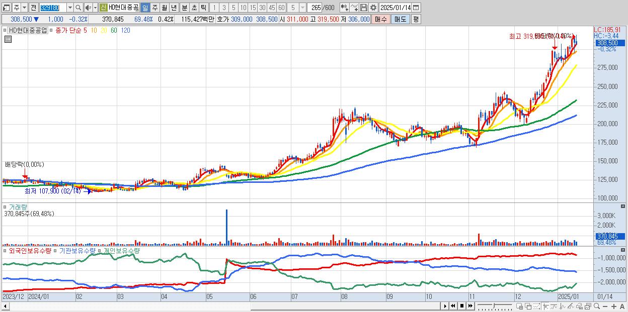 - HD현대중공업 (308,500원 ▼ -0.32% , 시총: 273,865억, 거래량: 370,845, 거래대금:1,154억)