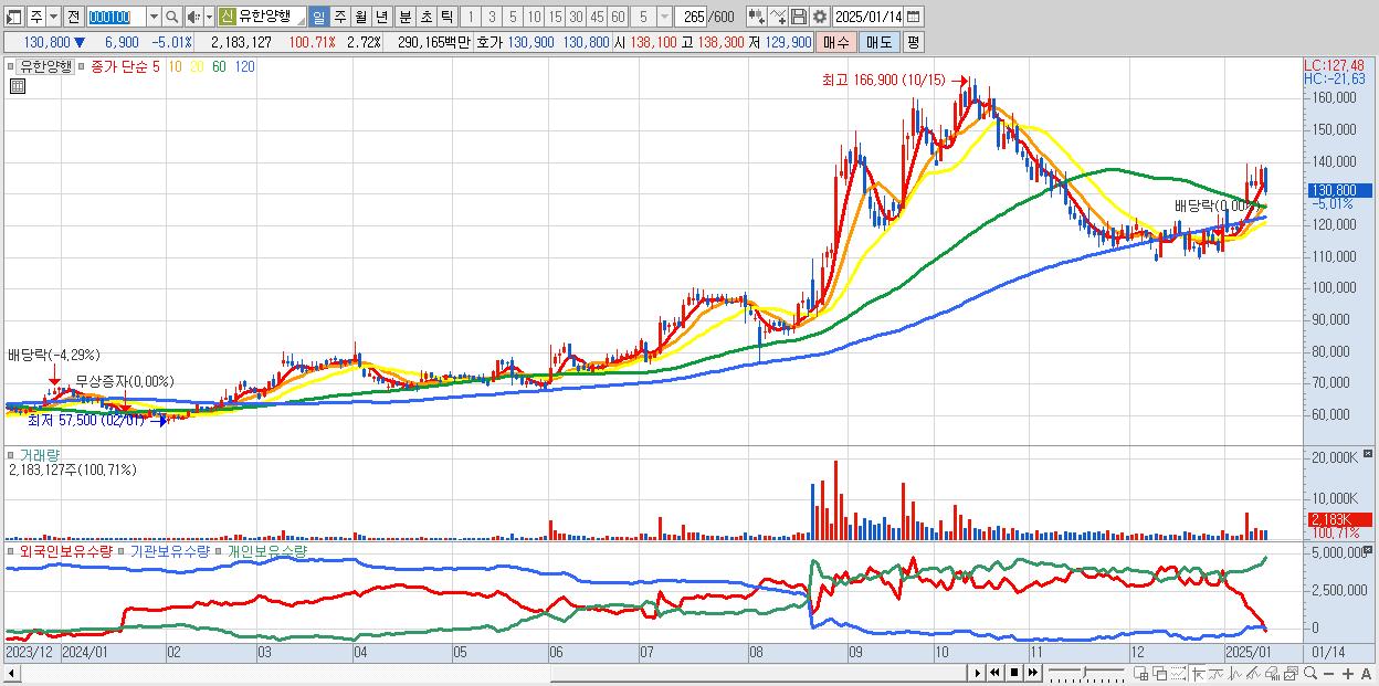 - 유한양행 (130,800원 ▼ -5.01% , 시총: 104,913억, 거래량: 2,183,127, 거래대금:2,902억)