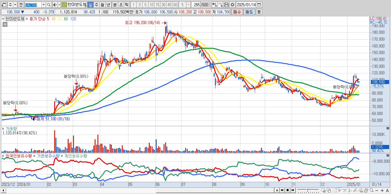 - 한미반도체 (106,500원 ▼ -0.37% , 시총: 102,894억, 거래량: 1,120,814, 거래대금:1,195억)