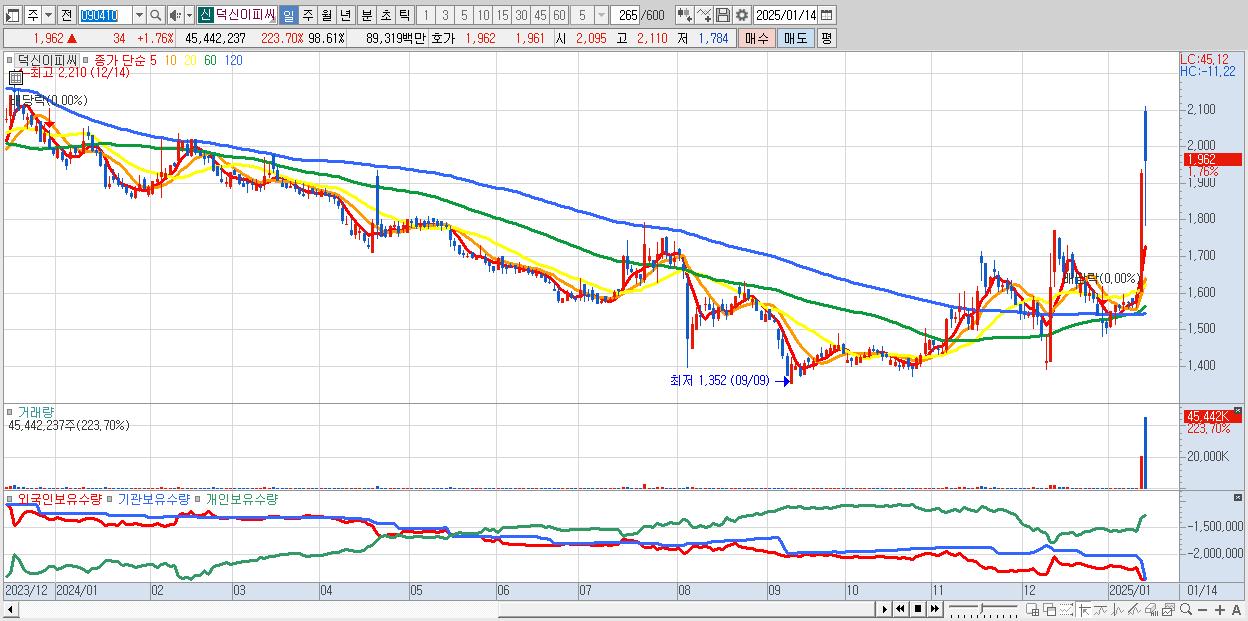 - 덕신이피씨 (1,962원 ▲ 1.76% , 시총: 904억, 거래량: 45,442,237, 거래대금:893억)