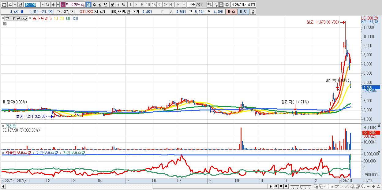 - 한국첨단소재 (4,460원 ▼ -29.98% , 시총: 440억, 거래량: 23,137,981, 거래대금:1,086억)