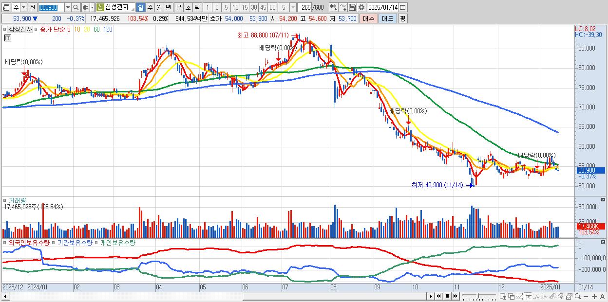 1.삼성전자 53,900원 ▼ -0.37% (KOSPI, 005930)