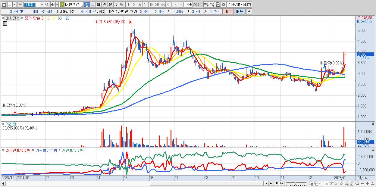- 대원전선 (3,890원 ▼ -2.51% , 시총: 2,917억, 거래량: 33,095,082, 거래대금:1,272억)