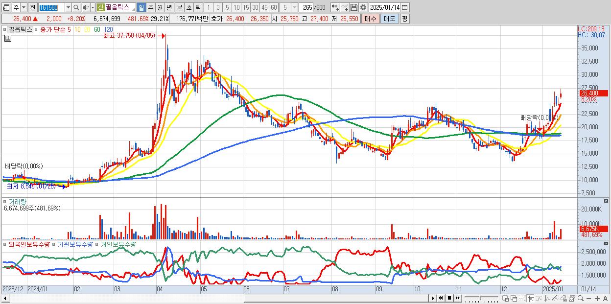 - 필옵틱스 (26,400원 ▲ 8.2% , 시총: 6,032억, 거래량: 6,674,699, 거래대금:1,768억)