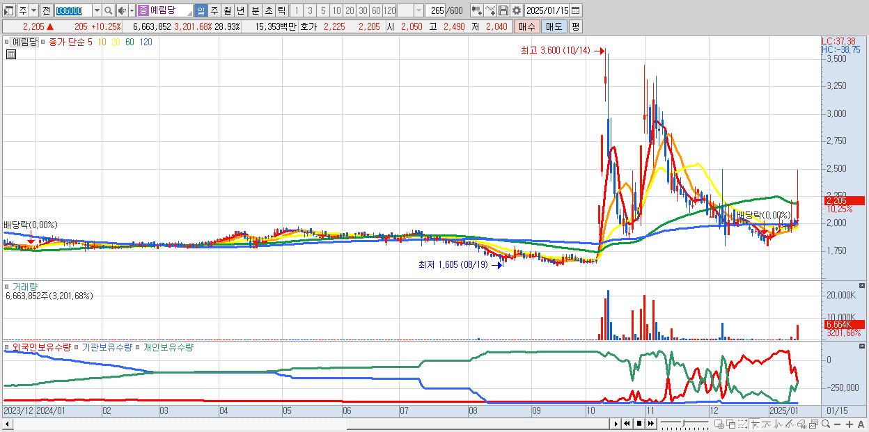 - 예림당 (2,205원 ▲ 10.25% , 시총: 508억, 거래량: 6,663,852, 거래대금:154억)