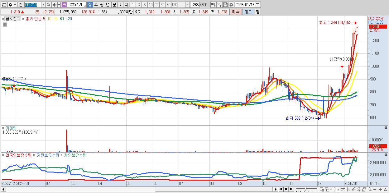 - 금호전기 (1,310원 ▲ 2.75% , 시총: 735억, 거래량: 1,055,082, 거래대금:14억, KOSPI)