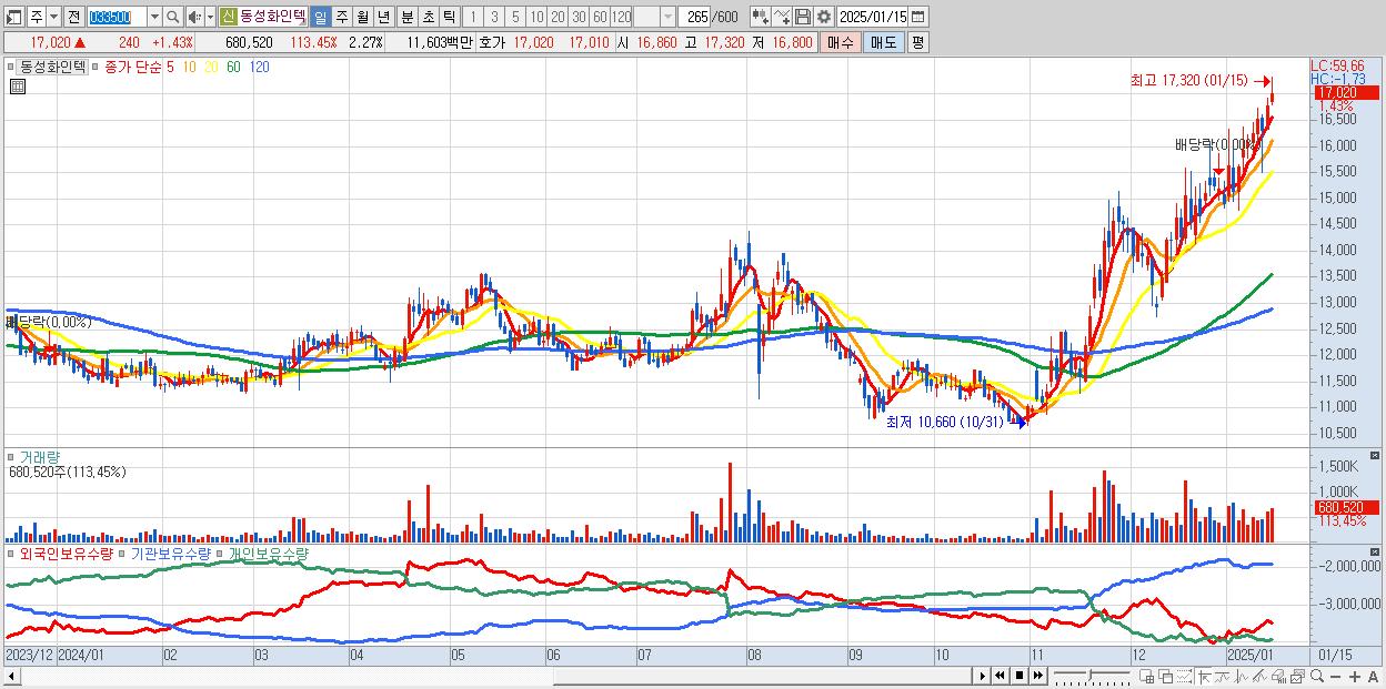 - 동성화인텍 (17,020원 ▲ 1.43% , 시총: 5,104억, 거래량: 680,520, 거래대금:116억, KOSDAQ)