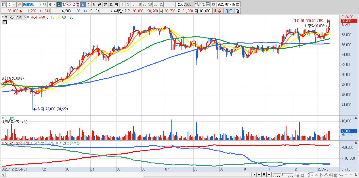 - 한국기업평가 (90,800원 ▲ 1.34% , 시총: 4,123억, 거래량: 4,583, 거래대금:4억, KOSDAQ)
