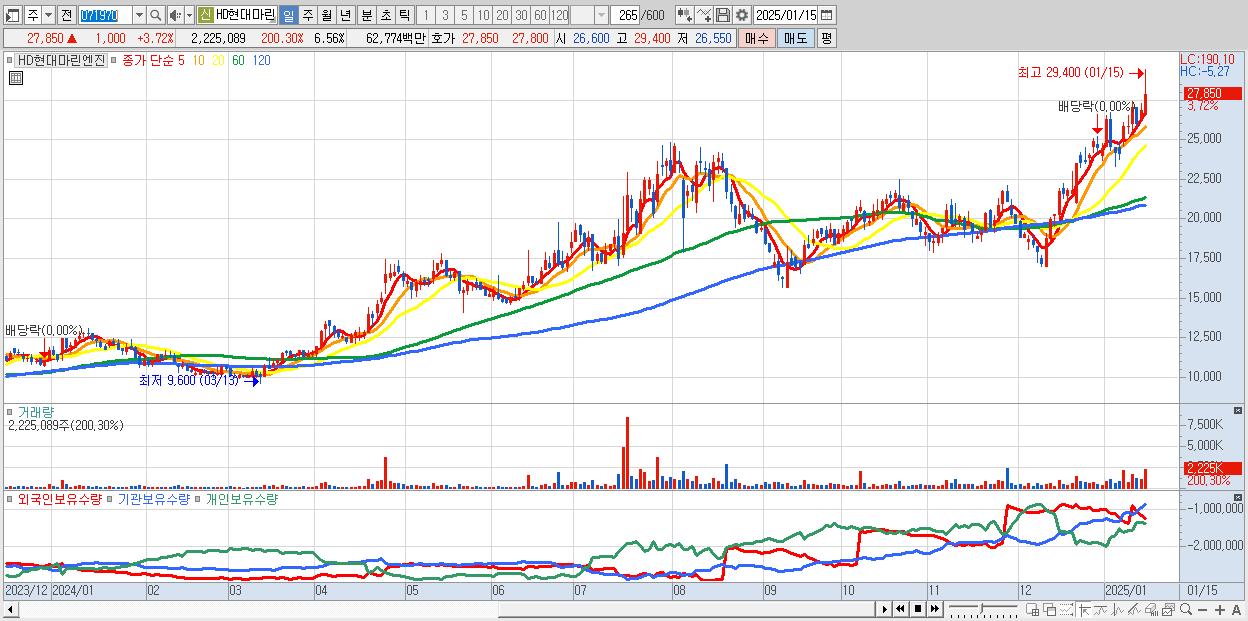 - HD현대마린엔진 (27,850원 ▲ 3.72% , 시총: 9,447억, 거래량: 2,225,089, 거래대금:628억, KOSPI)