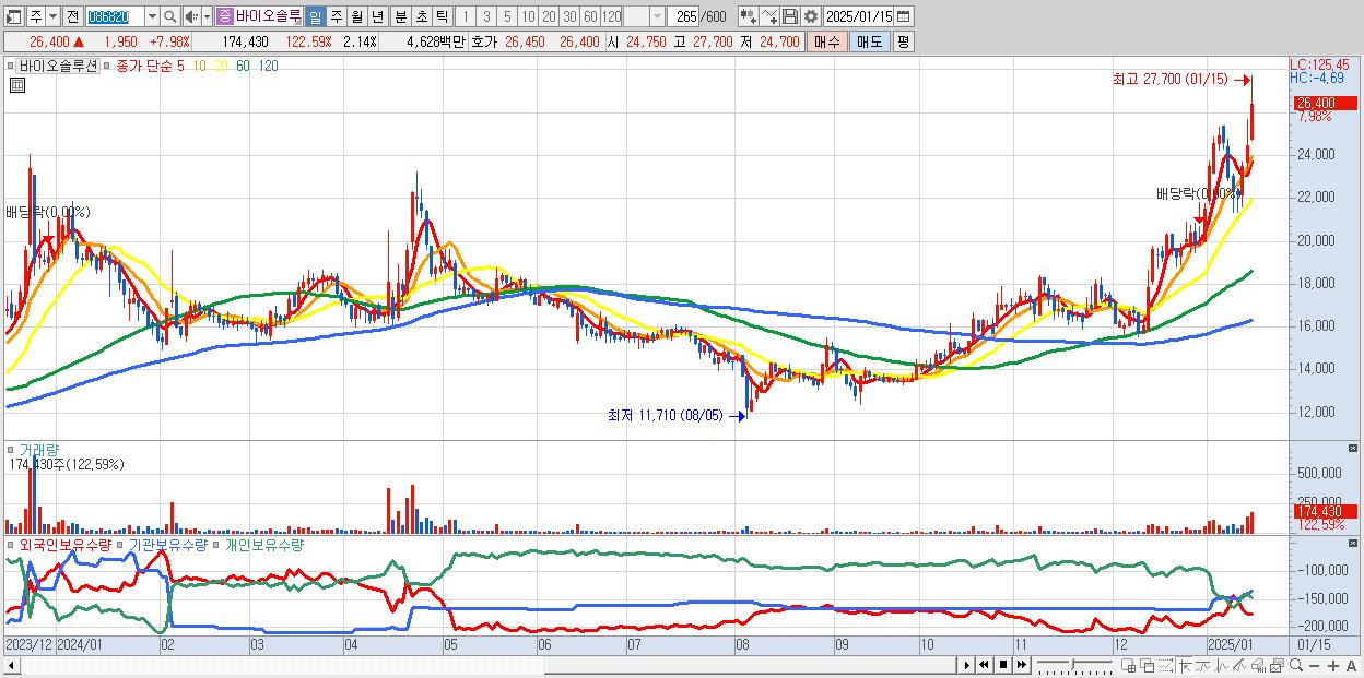 - 바이오솔루션 (26,400원 ▲ 7.98% , 시총: 2,150억, 거래량: 174,430, 거래대금:46억, KOSDAQ)