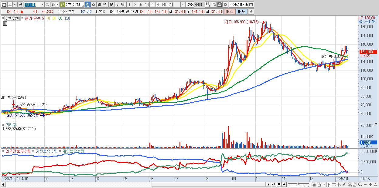 - 유한양행 (131,100원 ▲ 0.23% , 시총: 105,154억, 거래량: 1,368,724, 거래대금:1,814억)