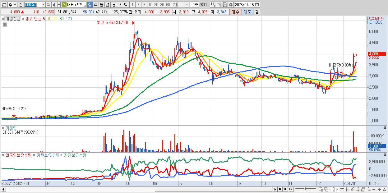 - 대원전선 (4,000원 ▲ 2.83% , 시총: 2,999억, 거래량: 31,801,344, 거래대금:1,250억)