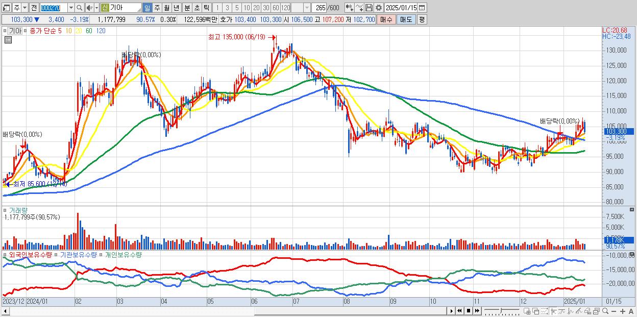 - 기아 (103,300원 ▼ -3.19% , 시총: 410,796억, 거래량: 1,177,799, 거래대금:1,226억)