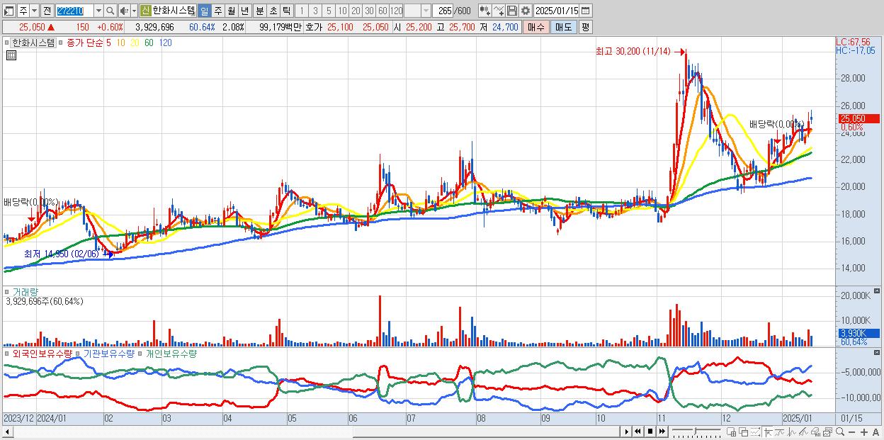 - 한화시스템 (25,050원 ▲ 0.6% , 시총: 47,324억, 거래량: 3,929,696, 거래대금:992억)