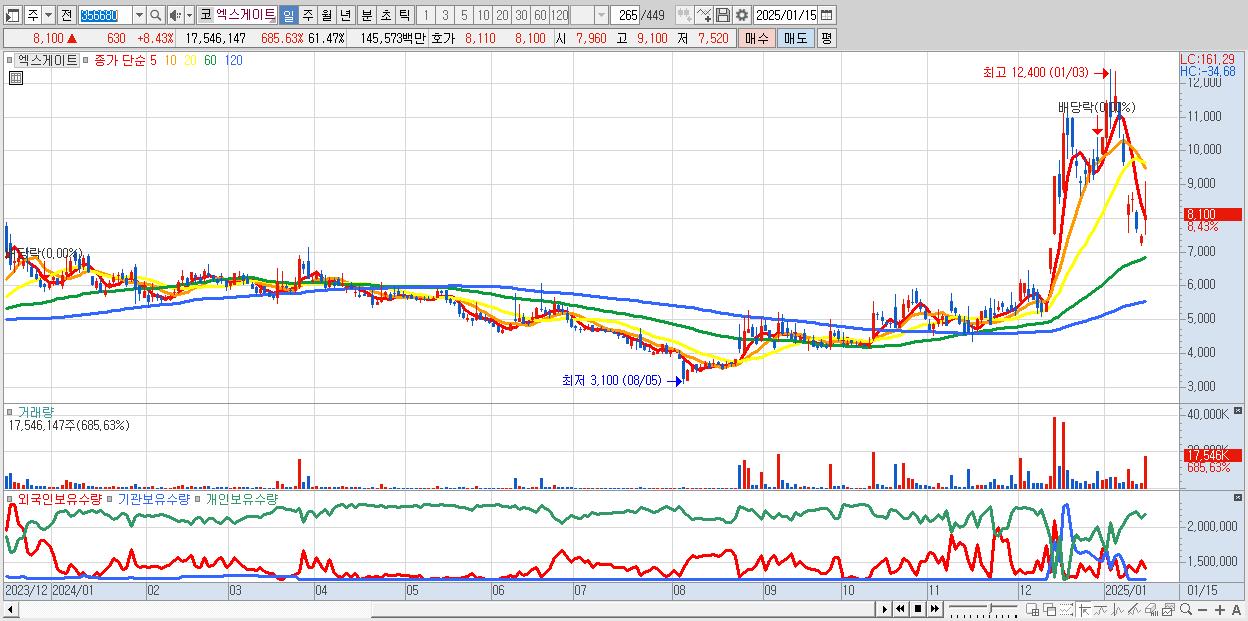 - 엑스게이트 (8,100원 ▲ 8.43% , 시총: 2,312억, 거래량: 17,546,147, 거래대금:1,456억)
